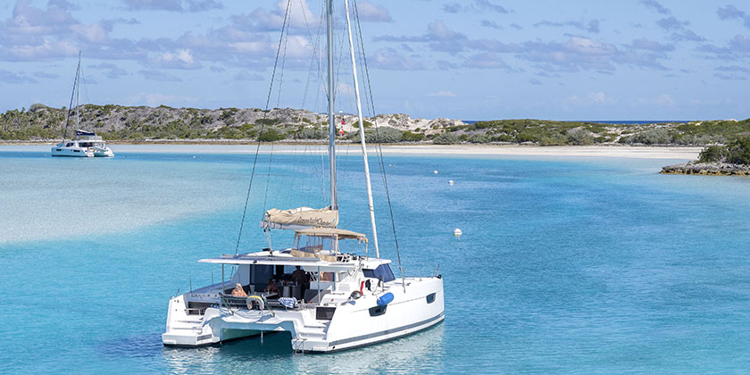This cruising ground—the Exumas, a district in The Bahamas made up of 365 islands and coral cays—is sheltered to the east by a necklace of scantly populated islands. Even so, there’s no shortage of activity. On our last day we drop the hook for lunch and dinghy ashore to a beach occupied by a colony of Bahamian rock iguanas. Here at Warderick Wells nurse sharks constantly circle our boat in search of lunch, at another anchorage sea turtles surface mere metres from our chartered Dream Yacht Charter catamaran, a seaworthy Fountaine-Pagot 42’ named Eden Blue.
