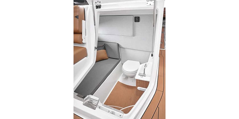 Stepping aboard, one of the most notable additions is the fully enclosed head compartment with a plumbed vacuum-flush toilet and a 10-gallon holding tank. Whether it’s offering convenience for longer excursions or providing privacy when anchored out for the day, this feature elevates the onboard experience to yacht-like standards. The compartment even doubles as a comfortable lounge area, thanks to a chaise-style bench perfect for giving kids a place to recharge between swims.