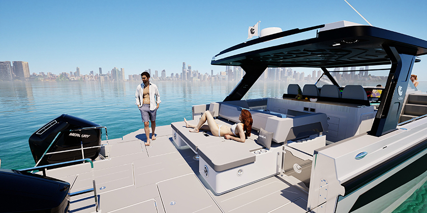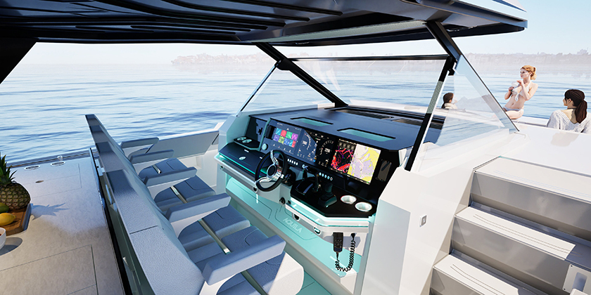 Poste de pilotage quatre places : le poste de pilotage établit une nouvelle norme avec quatre sièges et un agencement moderne et novateur qui met toutes les fonctionnalités à portée de main. Les traceurs de cartes encastrés de 16 pouces, la stéréo marine Fusion Apollo et l’écran C-Zone de 5 pouces avec commandes ergonomiques des gaz et du joystick offrent un confort exceptionnel et une utilisation intuitive.
