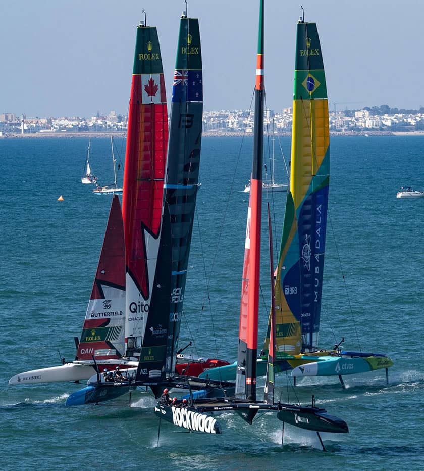 L’équipe Red Bull Italy SailGP, dirigée par Ruggero Tita, devance l’équipe canadienne NorthStar SailGP, dirigée par Giles Scott, lors d’une séance d’entraînement avant le DP World Spain Sail Grand Prix qui s’est tenu à Cadix, en Espagne, le mois dernier. Photo: Samo Vidic pour SailGP.