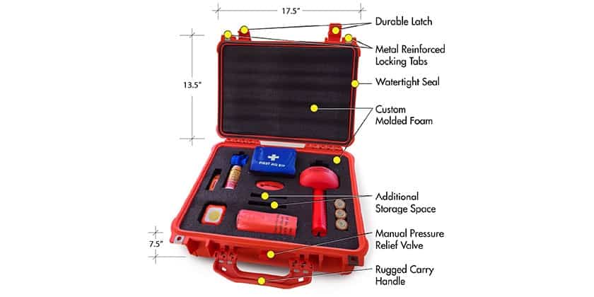 La mallette, qui flotte, est dotée d’une mousse sur mesure avec des découpes pour chaque élément, d’un joint étanche avec soupape de décompression. De plus, une étiquette d’entretien annuel est apposée sur le dessus et elle comporte quelques emplacements supplémentaires pour ranger des objets personnels.